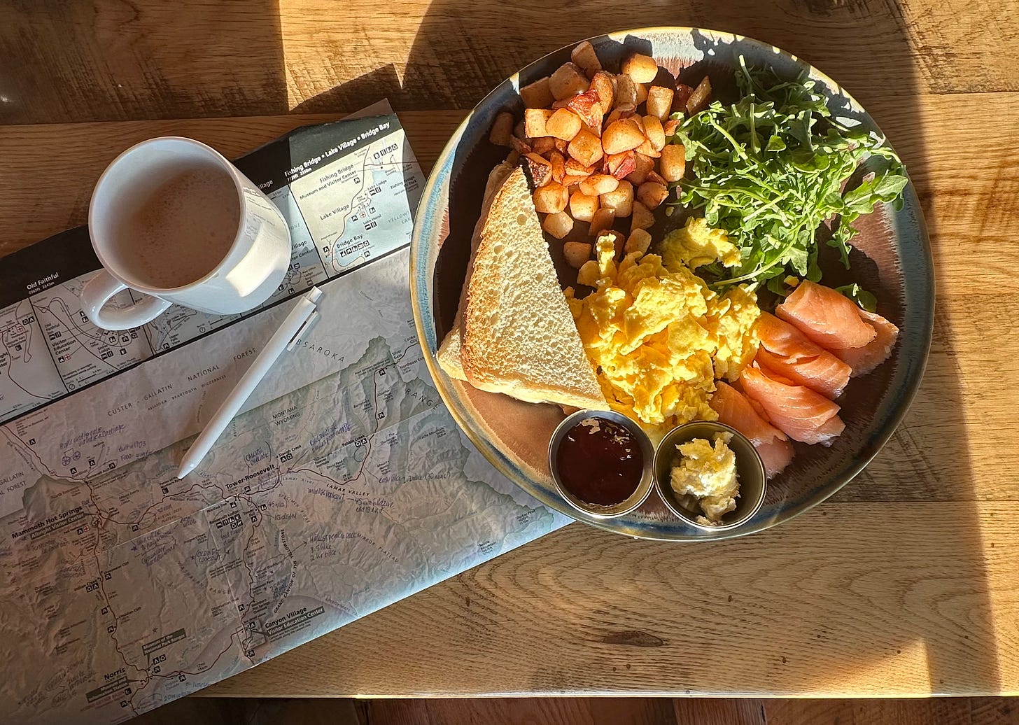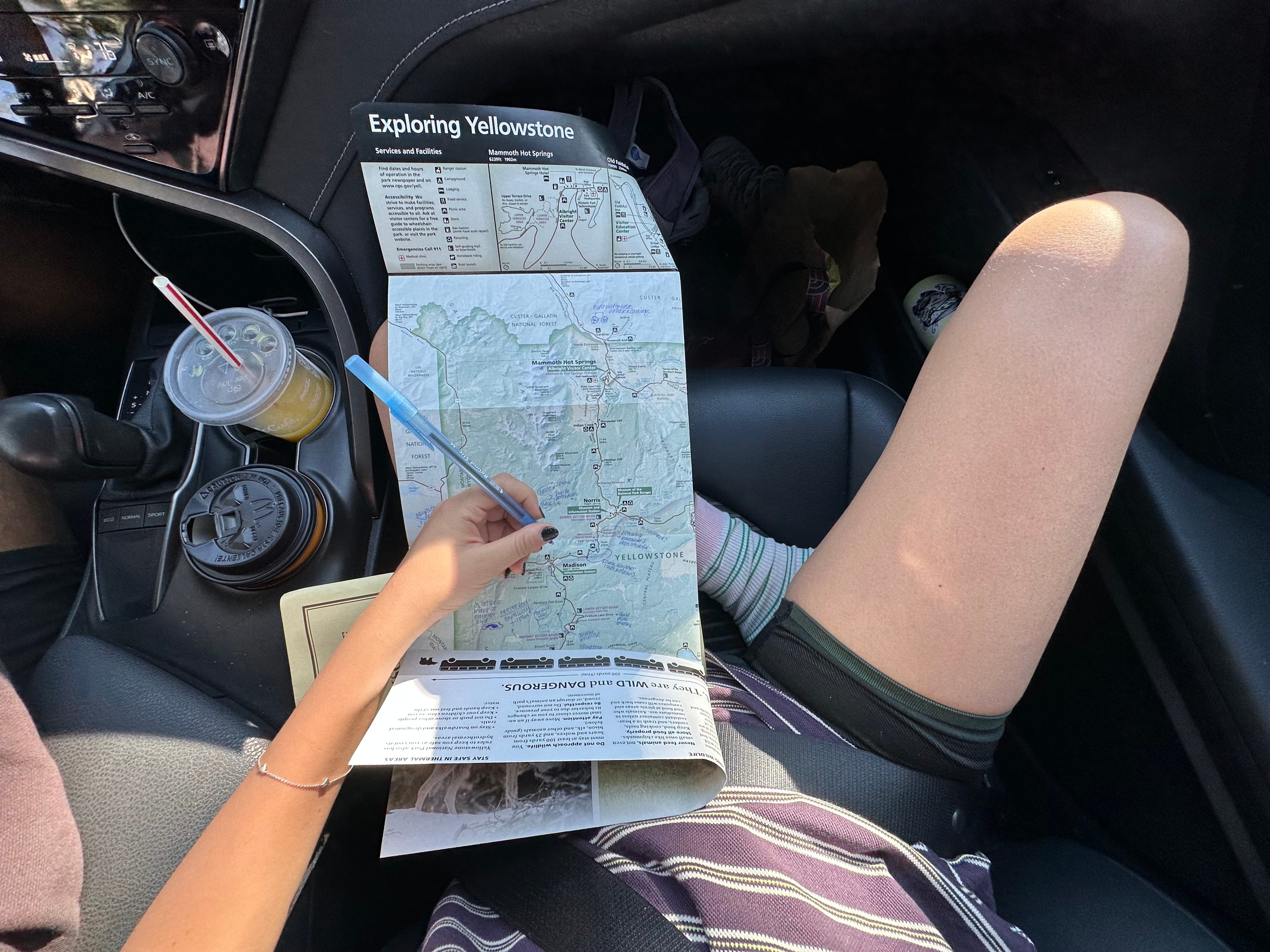 To allow myself some structure for this trip, I annotated the printed map that came with the park entrance fee. The map didn’t have any pictures — its best feature was how a fan-favorite lake and a shitty picnic spot were listed the same way. Obviously, I decided where to go depending on how funny the names were (Bacon Ridge and Delusion Lake were among my favorites). The fact that Yellowstone National Park is one large loop also helped. All I had to do was follow the signs.