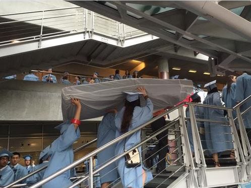 I was inspired by former artist Emma Sulkowicz, who carried a 50-pound mattress around campus in protest of Columbia University’s refusal to expel a classmate whom she accused of raping her. The performance piece, Mattress Performance (Carry That Weight), gives the emotional weight of Sulkowicz’s experience a tangible form. It was a “pure radical vulnerability,” according to legendary art critic Jerry Saltz.