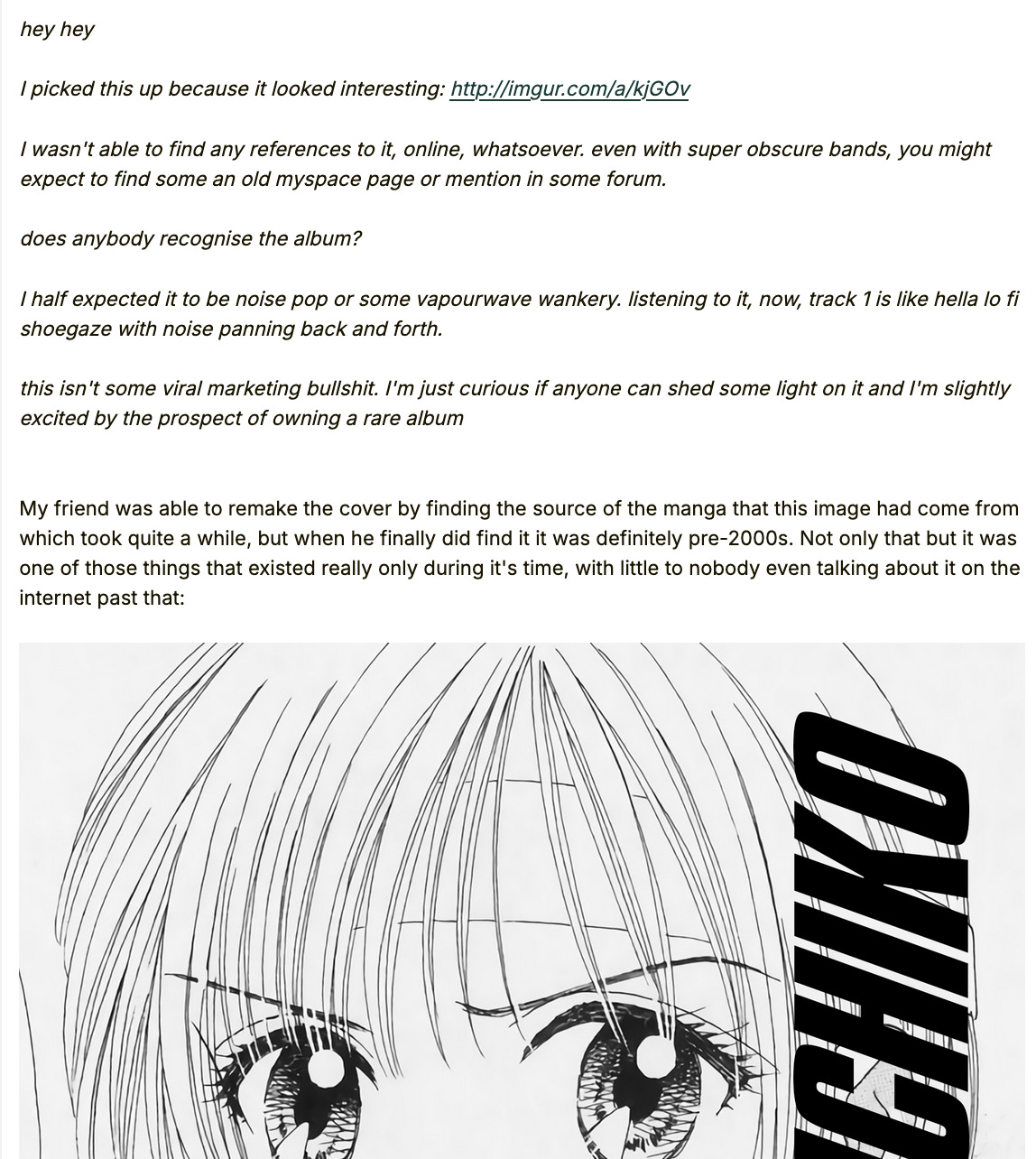 They quickly fell in love with the very hazy, bedroom-pop quality of the album and took to 4chan to locate the original artist. The uploaded audio files quickly went viral and people started analyzing the album’s audio quality and reviewing serial numbers, until someone scraped an old Facebook message board to discover 4 Nottingham teens (band name Panchiko) who burned a couple copies of Death Metal for their friends. Panchiko now has over 2 million listeners on Spotify. A lovely surprise.