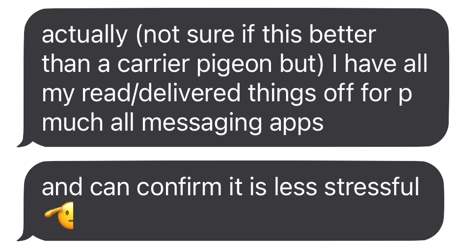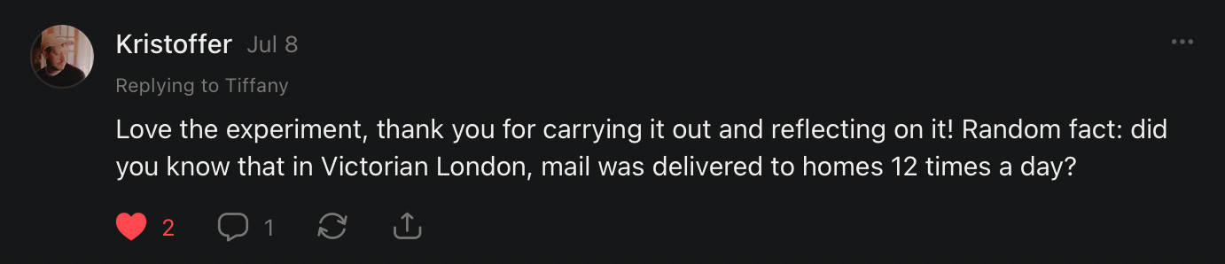 I learned, from the fab Kristoffer, that mail was delivered 12 times a day in Victorian London. If there was a limit to how much we could text (like there was in the early 2000s), would we only share more coherent, substantive thoughts? I admire people who text once a day — Jonathan Groff-style.