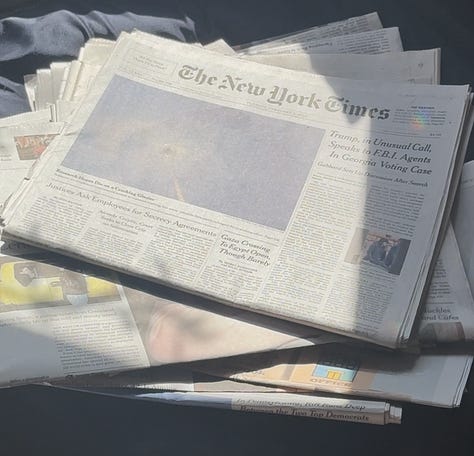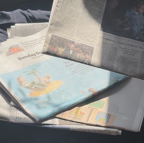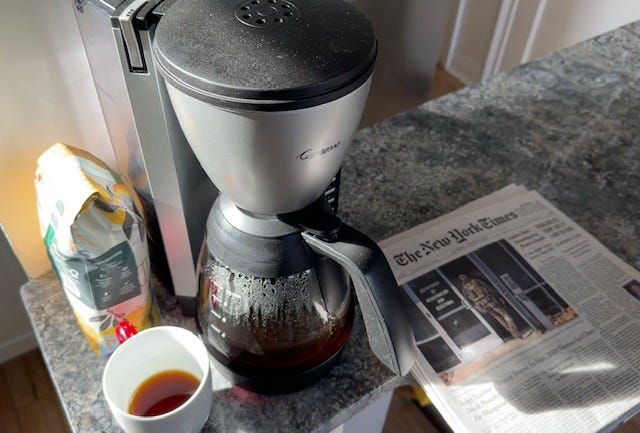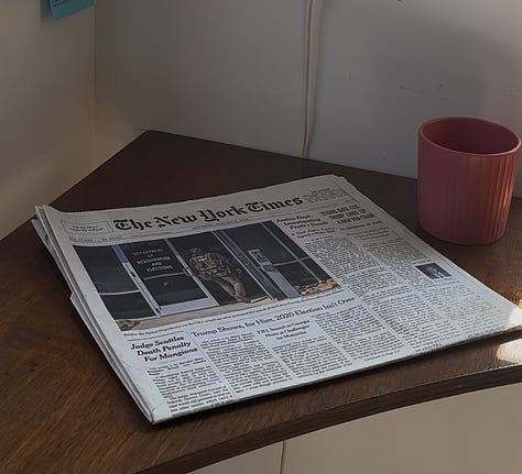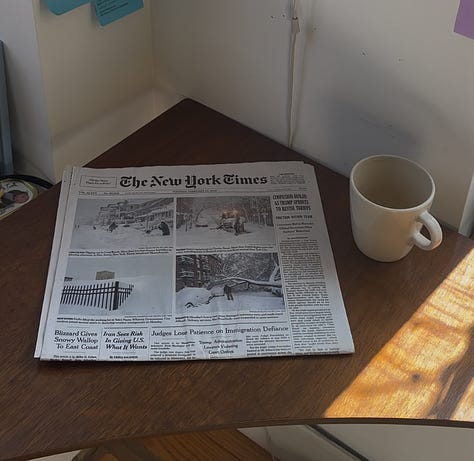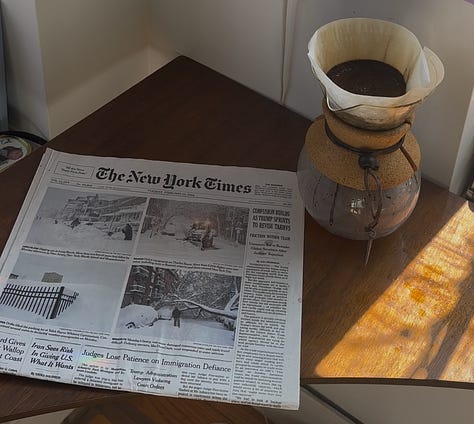 I followed a strict morning routine: put on a pot of coffee, grab my paper, and read as I charge my phone in the other room.3 It felt meditative. Nothing could interrupt me. There were no pop-up ads forcing me to give up my privacy preferences or sell me stuff. No clickbait. No hyperlinks for me to click into. Just printed text.