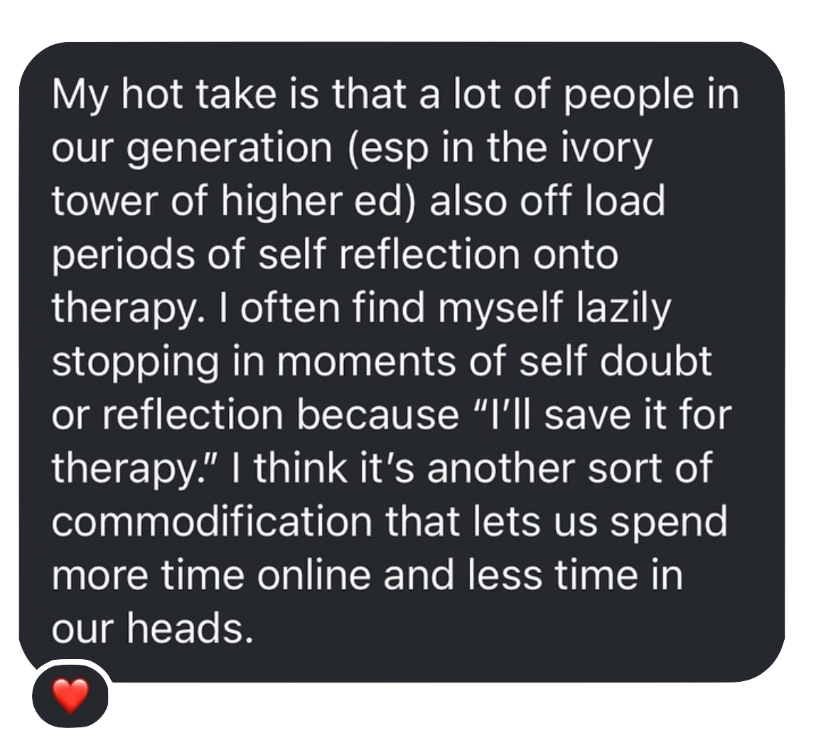A while back I wrote a post about the importance of boredom, and an old friend messaged me about how he caught himself saving his thoughts for therapy. There is a time and place for reflection, but do we really need to be paying for it?